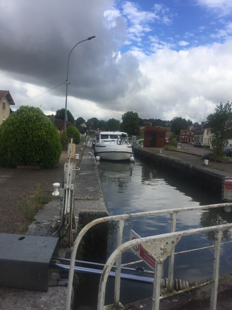 It’s quite different here in Rogny compared to Begur. It’s mainly flat, no mountains or ocean, but there is a very peaceful vibe of rolling plains of corn, grasses, and sunflowers. And then there’s the canal with its seven locks. Boats move through the canal, and also park there temporarily or permanently.