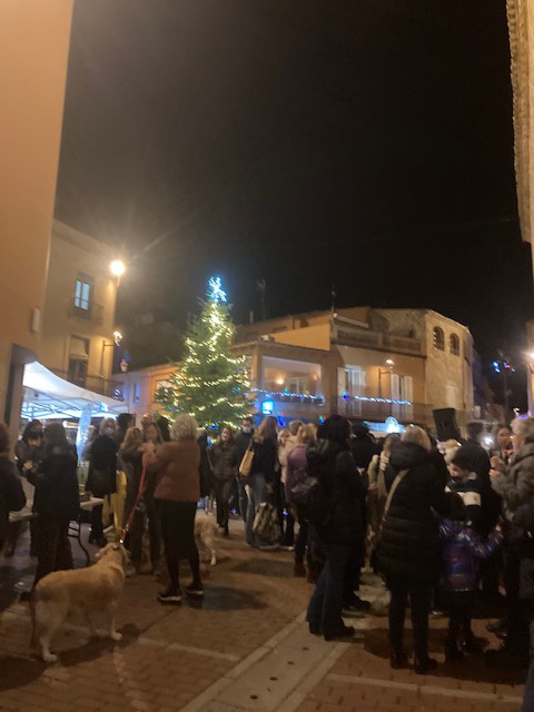 I went to the town’s tree-lighting ceremony last week. For a euro, I got a glass of champagne and a baggie with a chunk of angel food cake. There was a disc jockey playing mainly pop music, with a few Christmas songs thrown in, and a lot of the small children were dancing and having a grand time. There were lots of dogs there too (though not my ill-behaved ones).